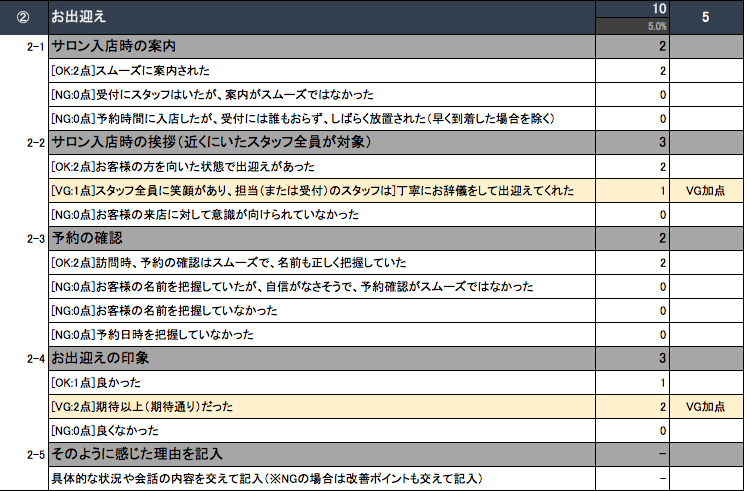 エステティックグランプリのモニター調査評価シートは、以下の10の項目から成り立っており、さらに細分化され約90個の評価項目で構成されています。(2018年現在)一般消費者の調査員が見て感じたままを評価できるように設問と選択肢を用意しており、調査員は、点数をつけるのではなく、「●○があり、●○だった」のようにあくまで来店時の状況を選択肢から選択し、その選択肢に予め配点が決められており、とくに、お客様が再来店(リピート)したいと思うときに重用視しやすい項目の配点を高くしております。